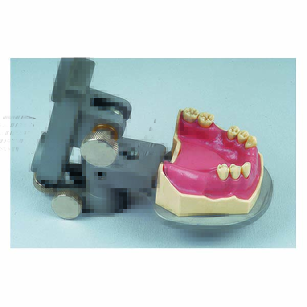 Universal articulator made of metal with knurled screws for tightening onto the articulated rod, for tightening the lower branch onto the articulated rod in the maximum mouth opening position, for regulating and locking the protrusion and retrusion positions of the mouth, set screw for regulating the distance between the two branches, clamping screw for the upper and lower hemi-model. It is possible to affix mouth models from other manufacturing companies onto the universal articulator. It allows the adjustment of the model positioning on the branches thanks to the slotting of the screw through-holes and the freedom of anterior-posterior sliding according to a mean Bennet angle.